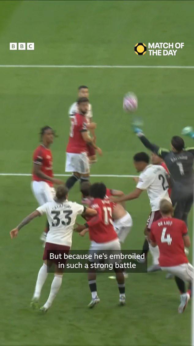 分析进球时,乔-哈特在画面定格于皮球进入禁区的一刻时说:“当球运行到这里时,巴因迪尔应该非常清楚,他要拿到球,所以现在他需要摆脱萨利巴并为自己创造空间,以便更好地应对来球,他肯定知道自己无法接住球,但他必须打出一记强有力的解围。”